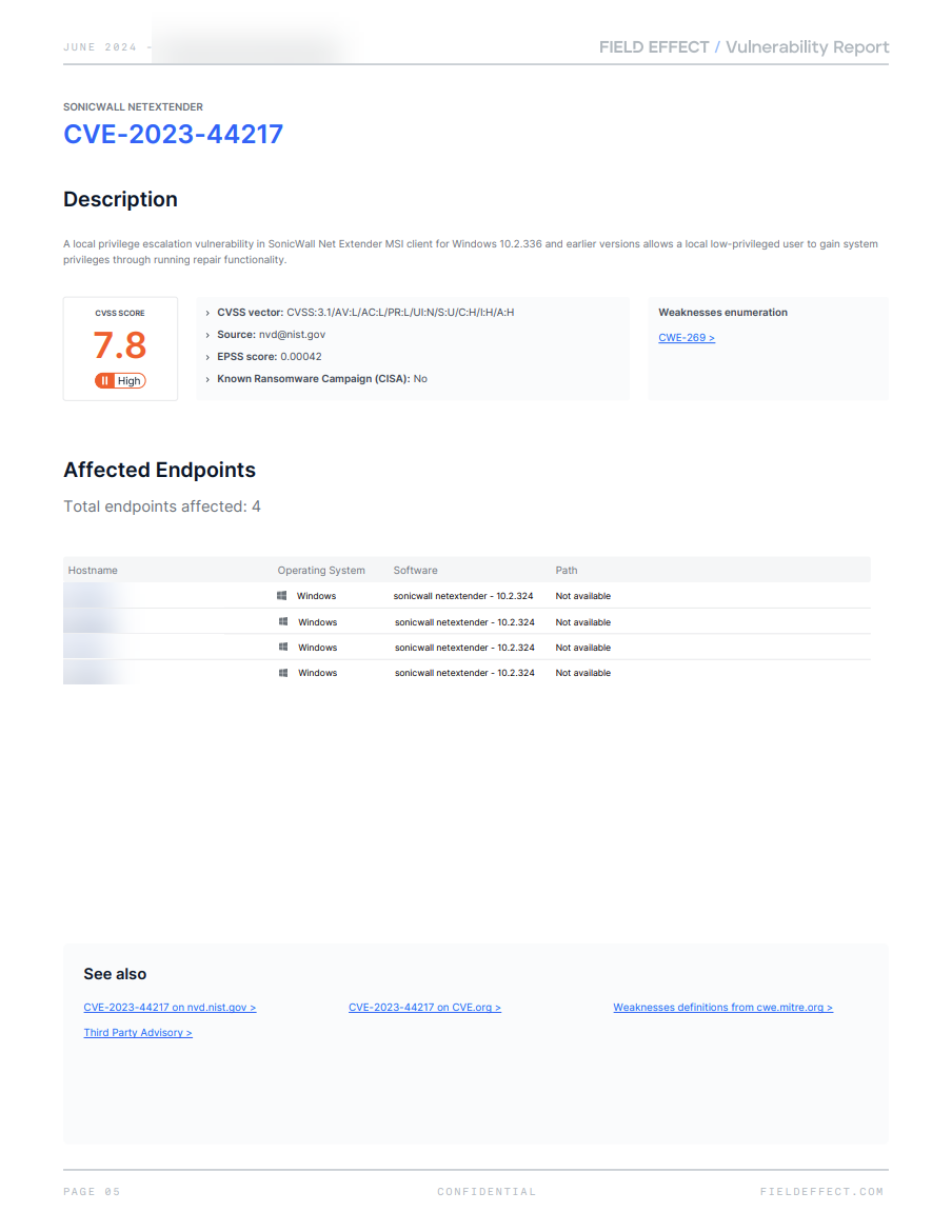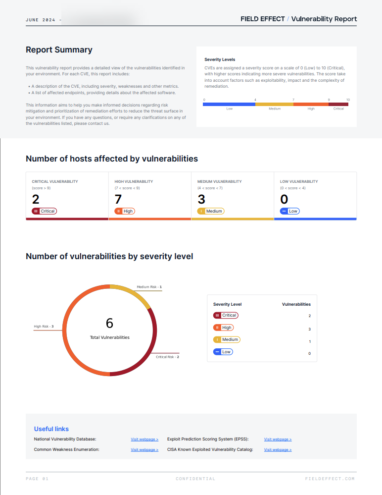 The first page of the report summarizes all theCVEs Field Effect has detected within a month. CVEs are grouped by severity level, and the number of endpoints is also tallied, along with number of CVEs per severity level. Helpful links are also included to deepen your knowledge about the issues that may be impacting your organization.