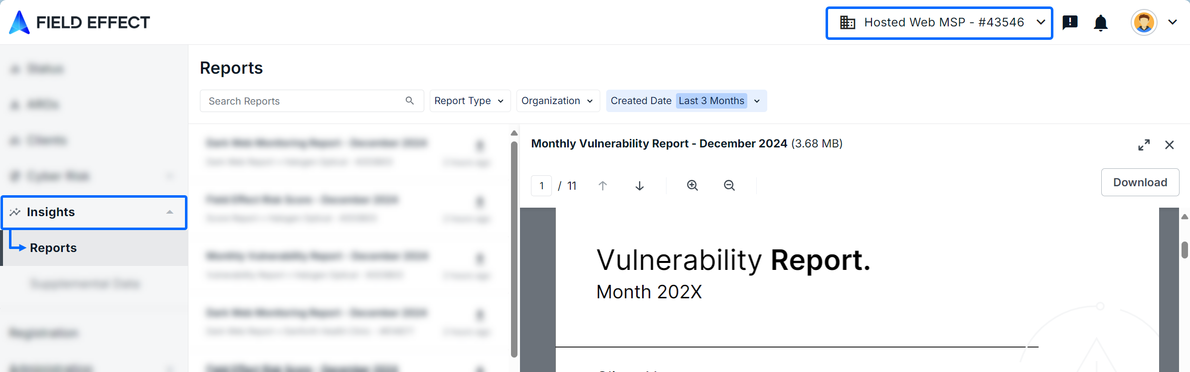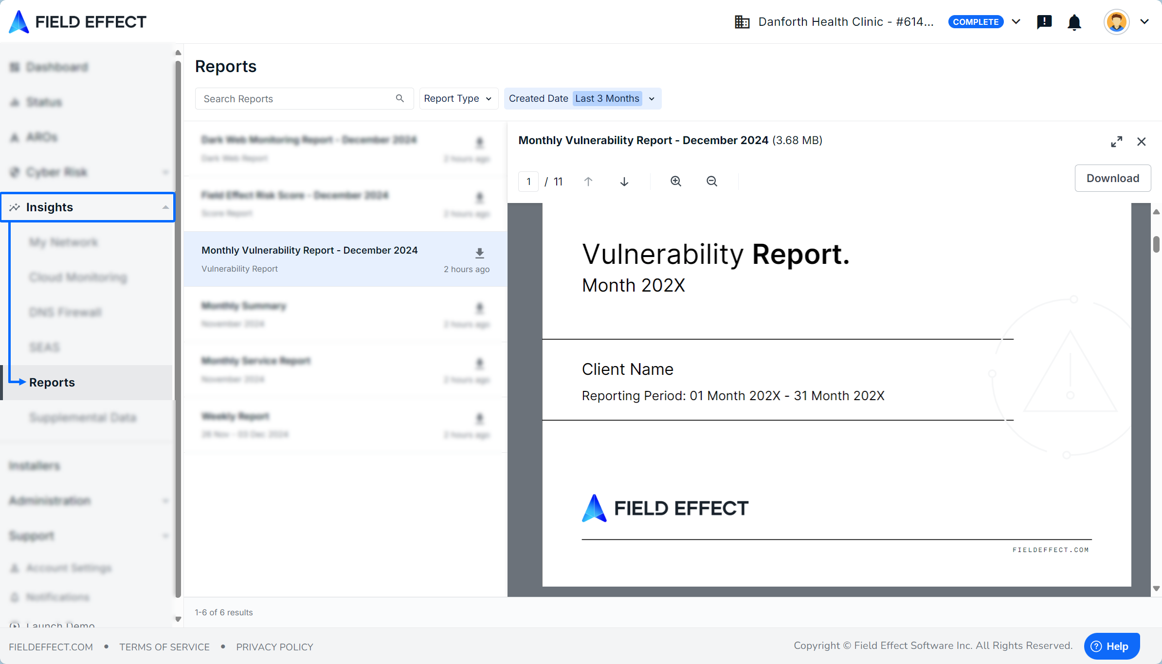 This report, along with all other Field Effect reports, can be accessed from the Insights section's Reports view.