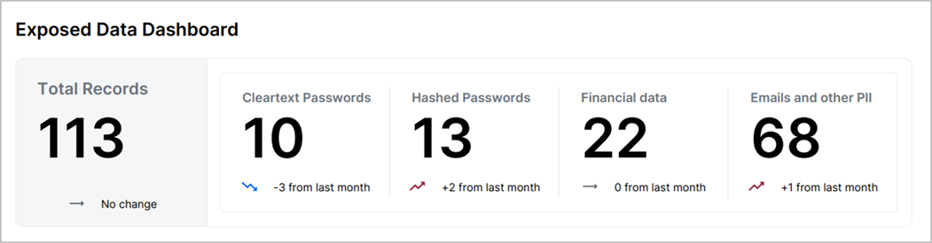 The dashboard tallies all exposed data types found within the month, and the Total Records entry in this section represents the total number of exposed records across all data types. In the example below, the report has identified 79 clear text passwords and 79 hashed passwords exposed on the dark web. Therefore, their total records observed for the month is 158. Any positive or negative changes will also be noted in this are, when applicable.