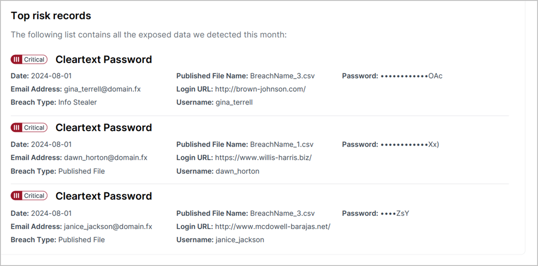 The Top risk records section brings the three most severe exposures to your attention. These records should be mitigated as soon as possible, and please see “Mitigating Risks Associated with Exposed Data” below for more on acting on your report’s findings.