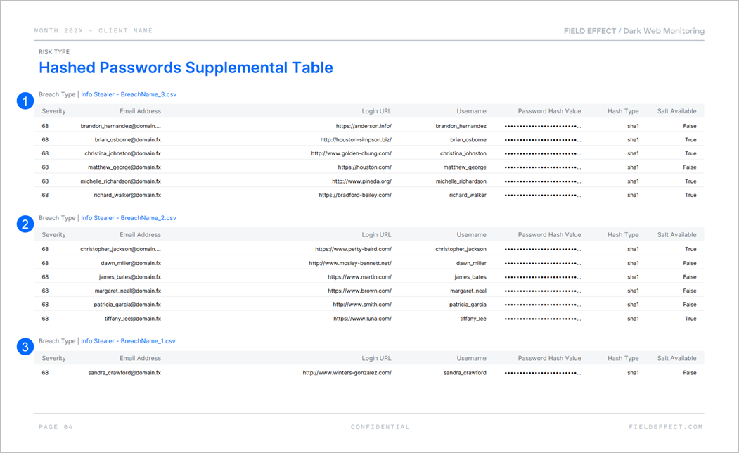 If the report discovers compromised data across more than one breach of the same content type, a separate supplemental table will be included for each breach in that section. In the example below, the organization’s hashed passwords were exposed in three separate breaches, so there are three separate tables in this report’s Supplemental Table section for hash passwords.