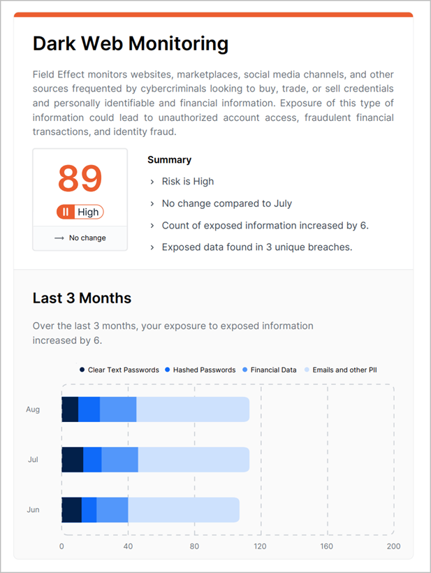 This is why Field Effect monitors these, and other, sources frequented by cybercriminals looking to buy, trade, or sell credentials, PII, and financial information, and provides our users with a monthly summary of what was detected.