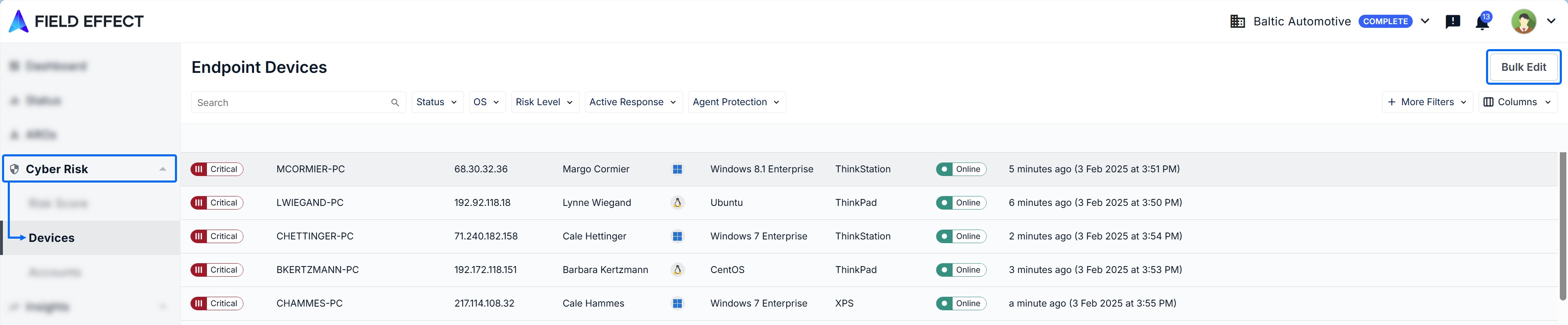 From the Devices page (Cyber Risk section), click Bulk Edit in the upper right.