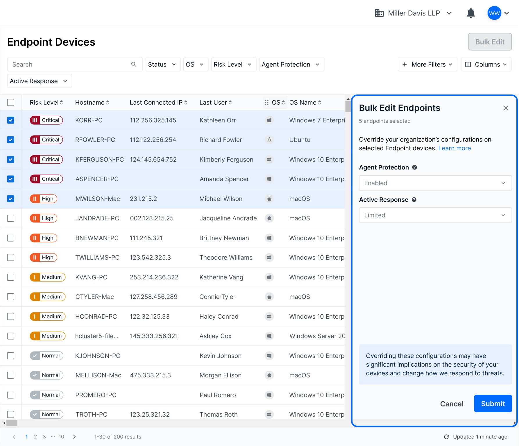 Checkboxes will appear in the table, and the Bulk Edit Endpoints pane will expand on the right. Use the check boxes to select the endpoints you want to edit. Once selected, make your configuration changes in the Edit pane and click Submit to confirm.